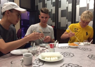 Bol to super zážitok. Čakal som že rovno pôjdeme domov nech sa trocha aklimatizujem Ale my sme išli rovno na uvítaciu večeru. Večera bola neskutočná toľko nového jedla som ešte naraz neskúšal. Najväčší zážitok pre mňa bolo že som sa musel rýchlo naučiť jesť čínskymi paličkami inak by som bol hladný (Ale nie mal som pripravený príbor). Toho jedla bolo tak veľa že na druhý deň som bol stále plný