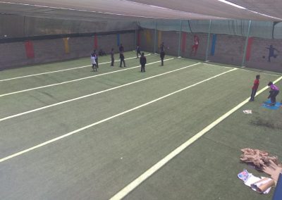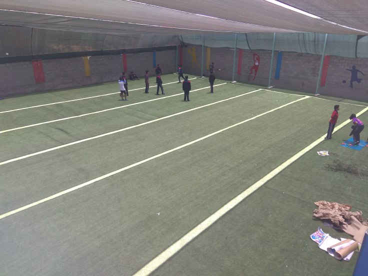 Rychlé představení školy. Dvě vetší budovy s třídami – jedna je zatím neobydlená – škola je mladá a příštím rokem se v této bodově vytvoří první třída. Fotbalové hřiště s umělou trávou, hřiště pro děti s plastovými domečky, menší budova pro kanceláře školy. Toť vše.